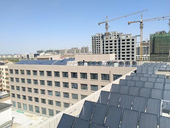 技术要求:该项目热水系统以太阳能供热水为主,共采用300块格瑞德平板集热器,集热器面积600平方,3台40KW格瑞德空气源热泵热水机做为辅助能源。