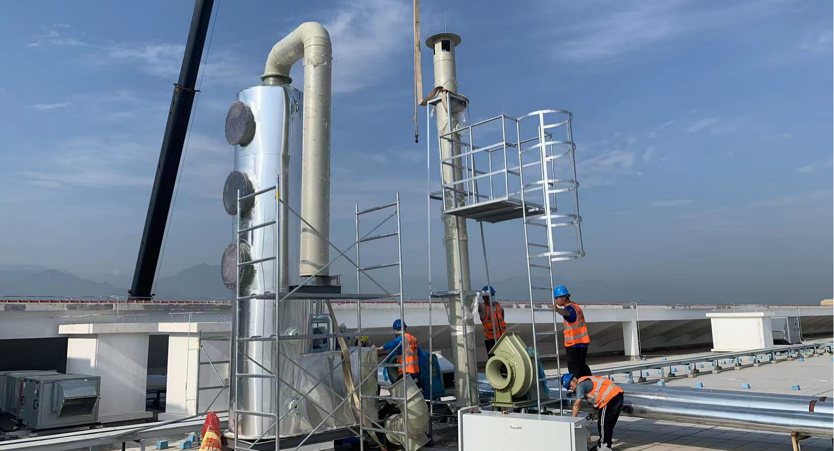 喷淋塔、风机、电控、烟囱支架、检测平台、爬梯护栏,设备间连接管道。
