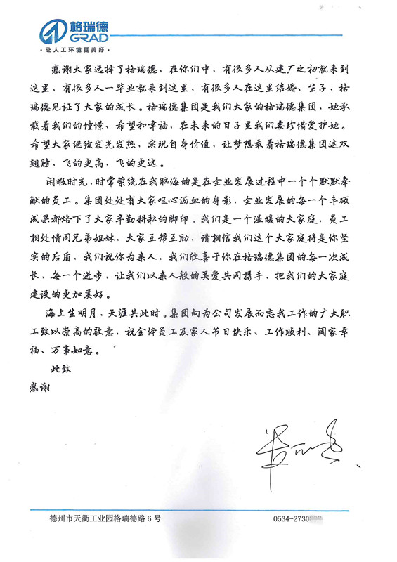 感谢大家选择了格瑞德,在你们中,有很多人从建厂之初就来到这里,有很多人一毕业就来到这里,有很多人在这里结婚、生子,格瑞德见证了大家的成长。格瑞德集团是我们大家的格瑞德集团,她承载着我们的憧憬、希望和幸福,在未来的日子里我们要珍惜爱护她。希望大家继续发光发热,实现自身价值,让梦想乘着格瑞德集团这双翅膀,飞的更高,飞的更远。