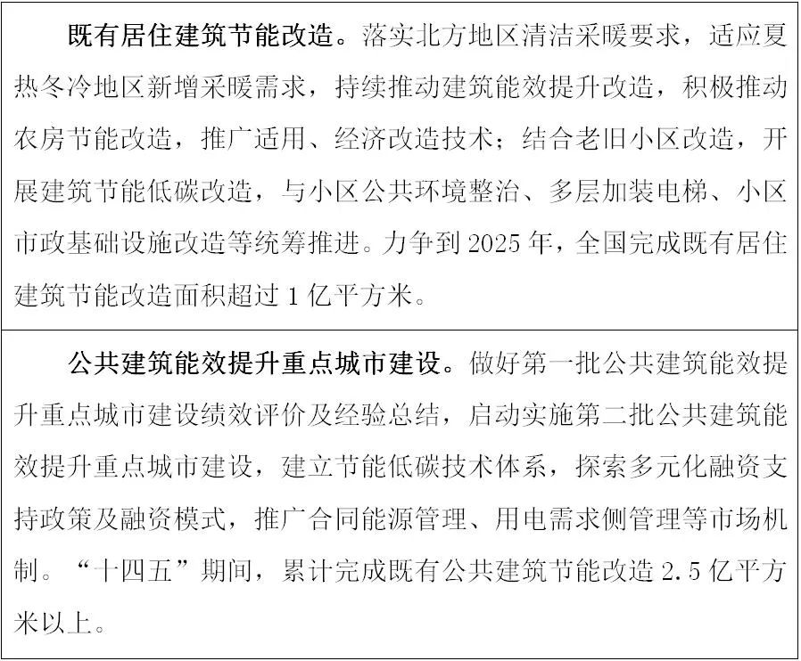 1.提高既有居住建筑节能水平。除违法建筑和经鉴定为危房且无修缮保留价值的建筑外,不大规模、成片集中拆除现状建筑。在严寒及寒冷地区,结合北方地区冬季清洁取暖工作,持续推进建筑用户侧能效提升改造、供热管网保温及智能调控改造。在夏热冬冷地区,适应居民采暖、空调、通风等需求,积极开展既有居住建筑节能改造,提高建筑用能效率和室内舒适度。在城镇老旧小区改造中,鼓励加强建筑节能改造,形成与小区公共环境整治、适老设施改造、基础设施和建筑使用功能提升改造统筹推进的节能、低碳、宜居综合改造模式。引导居民在更换门窗、空调、壁挂炉等部品及设备时,采购高能效产品。
