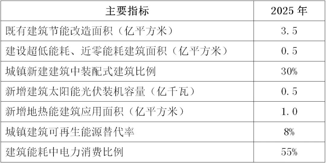 2.具体目标。到2025年,完成既有建筑节能改造面积3.5亿平方米以上,建设超低能耗、近零能耗建筑0.5亿平方米以上,装配式建筑占当年城镇新建建筑的比例达到30%,全国新增建筑太阳能光伏装机容量0.5亿千瓦以上,地热能建筑应用面积1亿平方米以上,城镇建筑可再生能源替代率达到8%,建筑能耗中电力消费比例超过55%。