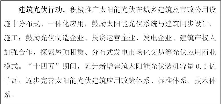 1.推动太阳能建筑应用。根据太阳能资源条件、建筑利用条件和用能需求,统筹太阳能光伏和太阳能光热系统建筑应用,宜电则电,宜热则热。推进新建建筑太阳能光伏一体化设计、施工、安装,鼓励政府投资公益性建筑加强太阳能光伏应用。加装建筑光伏的,应保证建筑或设施结构安全、防火安全,并应事先评估建筑屋顶、墙体、附属设施及市政公用设施上安装太阳能光伏系统的潜力。建筑太阳能光伏系统应具备即时断电并进入无危险状态的能力,且应与建筑本体牢固连接,保证不漏水不渗水。不符合安全要求的光伏系统应立即停用,弃用的建筑太阳能光伏系统必须及时拆除。开展以智能光伏系统为核心,以储能、建筑电力需求响应等新技术为载体的区域级光伏分布式应用示范。在城市酒店、学校和医院等有稳定热水需求的公共建筑中积极推广太阳能光热技术。在农村地区积极推广被动式太阳能房等适宜技术。