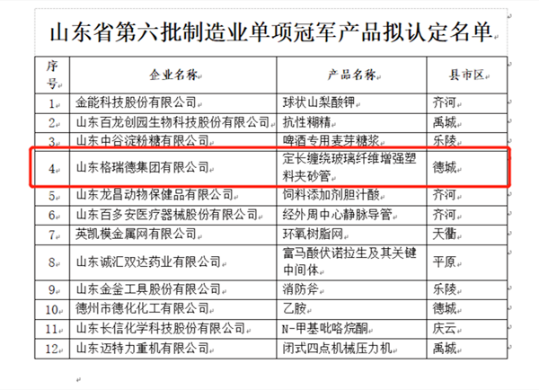 近日,格瑞德集团被中国复合材料工业协会缠绕专业委员会增选为副主席单位;同期,集团定长缠绕玻璃纤维增强塑料夹砂管经山东省工信厅确定,上榜山东省制造业单项冠军产品认定名单。