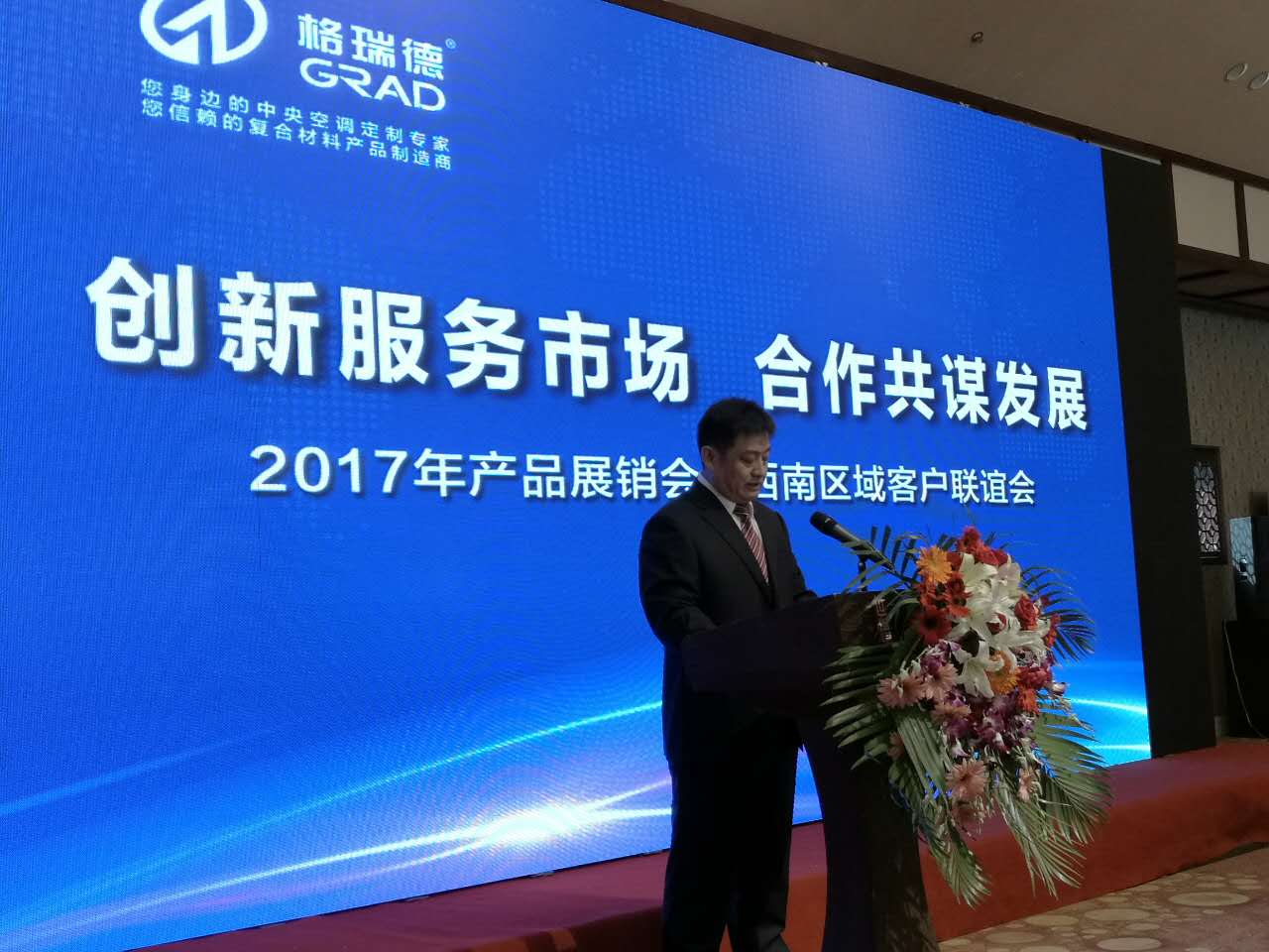 格瑞德集团董事长兼总裁管印贵先生对各位朋友的到来致以最真诚的欢迎。管总结合当前的经济形势,讲述了集团的五年发展规划,加快企业管理和人才队伍升级;加强发展和建设企业技术中心;通过两中心+两基地建设,全面布局中央空调和复合材料产业升级;大力发展产业平台,全面提升产业领导能力和平台化运营能力;以项目整体承揽能力为中心,大力发展中央空调核心业务;通过加强新产品、新项目的开发能力,全面开拓先进、复合材料制作领域。