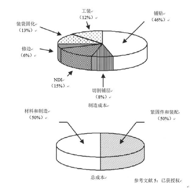 1996年由美国科学院和工程院下属的先进民用飞机新材料专业委员会编制的《下一代民用运输机用的新材料》中指出:“虽然复合材料的市场销量增长缓慢往往归因为原材料的高成本,但材料成本实际上仅占复合材料构件总成本的8%~10%。事实上工艺制造成本是总成本中最高的单项成本。过去性能因素推动着复合材料在航空航天中的应用研究,但近年来成本则起到了更大的作用。这样,开发下一代民用运输机工艺的一个基本准则是低成本制造的可能性。委员会相信,在可预见的将来,发展趋势是不断开发低成本的制造工艺。”