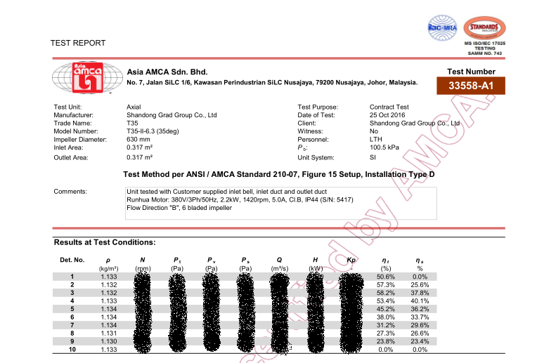 此次集团正在申报办理的SWF系列、T35系列风机CRP产品性能认证,已由AMCA亚洲区域马来西亚实验室完成空气动力性能、噪音测试工作,测试结果均合格,风机能效等级分别达到FEG67、FEG60,充分显示了格瑞德集团风机产品的优异性能,为产品获得最终认证奠定了基础,也为风机系列产品进军国际市场拿到了“入场券”。