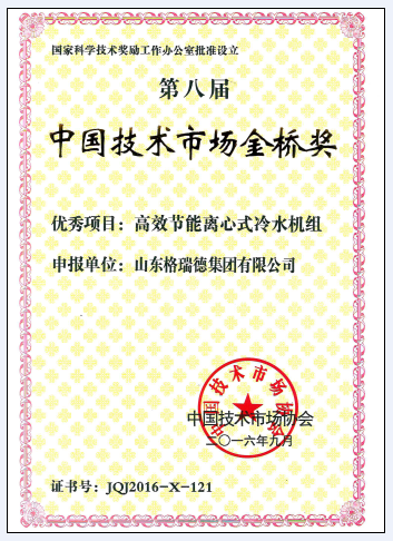11月18日,第八届中国技术市场金桥奖颁奖大会在北京人民大会堂盛大召开,我公司的“高效节能离心式冷水机组”荣获“中国技术市场金桥奖”优秀项目奖,该奖项属于全国技术市场领域较高奖项。