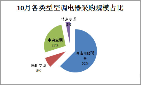 从产品方面看,10月清洁取暖设备采购规模18.1亿元,占比62%;排在第二的是中央空调,采购规模4.3亿元,占比27%;民用空调位居其三,采购规模为1.23亿元。