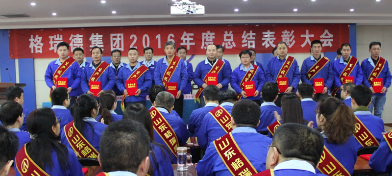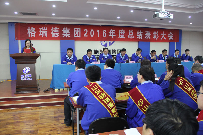 会议由集团监事长王春雷主持,集团副董事长王春和宣读了《格瑞德集团2016年度总结表彰决定》,集团董事长管印贵在总结2016年度工作的基础上,确立了2017年的工作目标和任务。会上,共有10个先进团队、50名先进工作者受到了隆重表彰。突出技术创新团队代表温雪莹同志、突出销售团队代表张连秀同志、突出管理推动团队代表谈庆松同志以及先进工作者代表济南办事处王建鹏同志分别在会上做了典型发言。