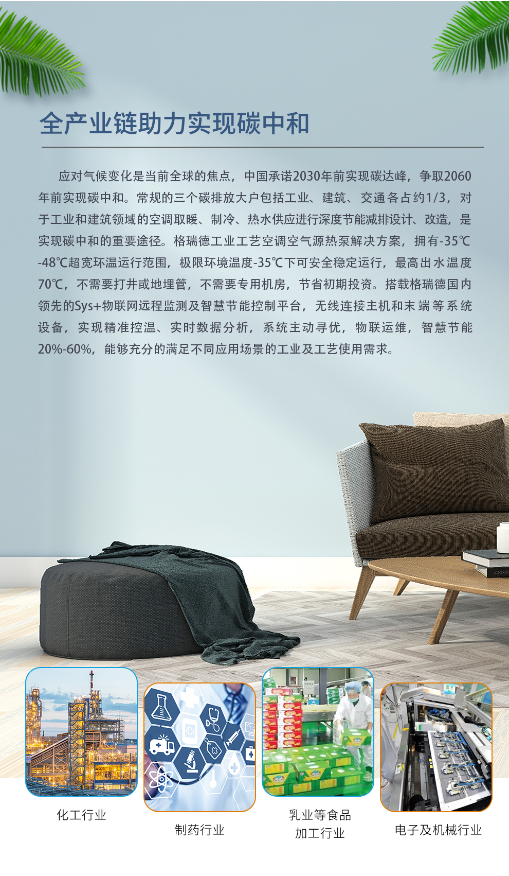 格瑞德致力于让人工环境更美好,通过打造空调工程、通风人防、复合材料、环保工程领域的全过程解决方案来满足客户需求,格瑞德构建了包括品牌规划、系统设计、技术开发、产品制造、整体施工、维护服务、检测认证、人才交流、产业集群的全生命周期产业链和产业生态。