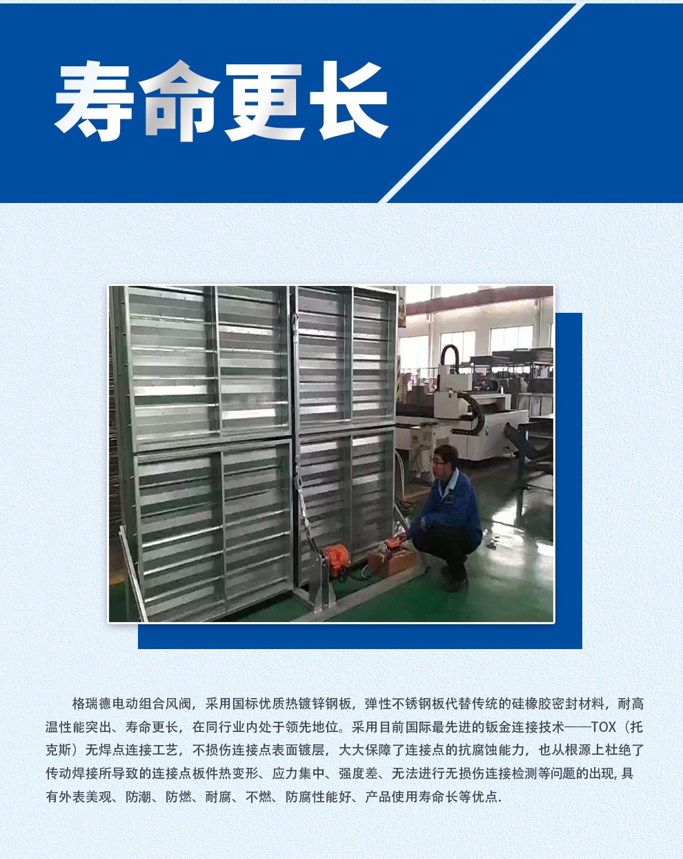 格瑞德致力于让人工环境更美好,通过打造空调工程、通风人防、复合材料、环保工程领域的全过程解决方案来满足客户需求,格瑞德构建了包括品牌规划、系统设计、技术开发、产品制造、整体施工、维护服务、检测认证、人才交流、产业集群的全生命周期产业链和产业生态。