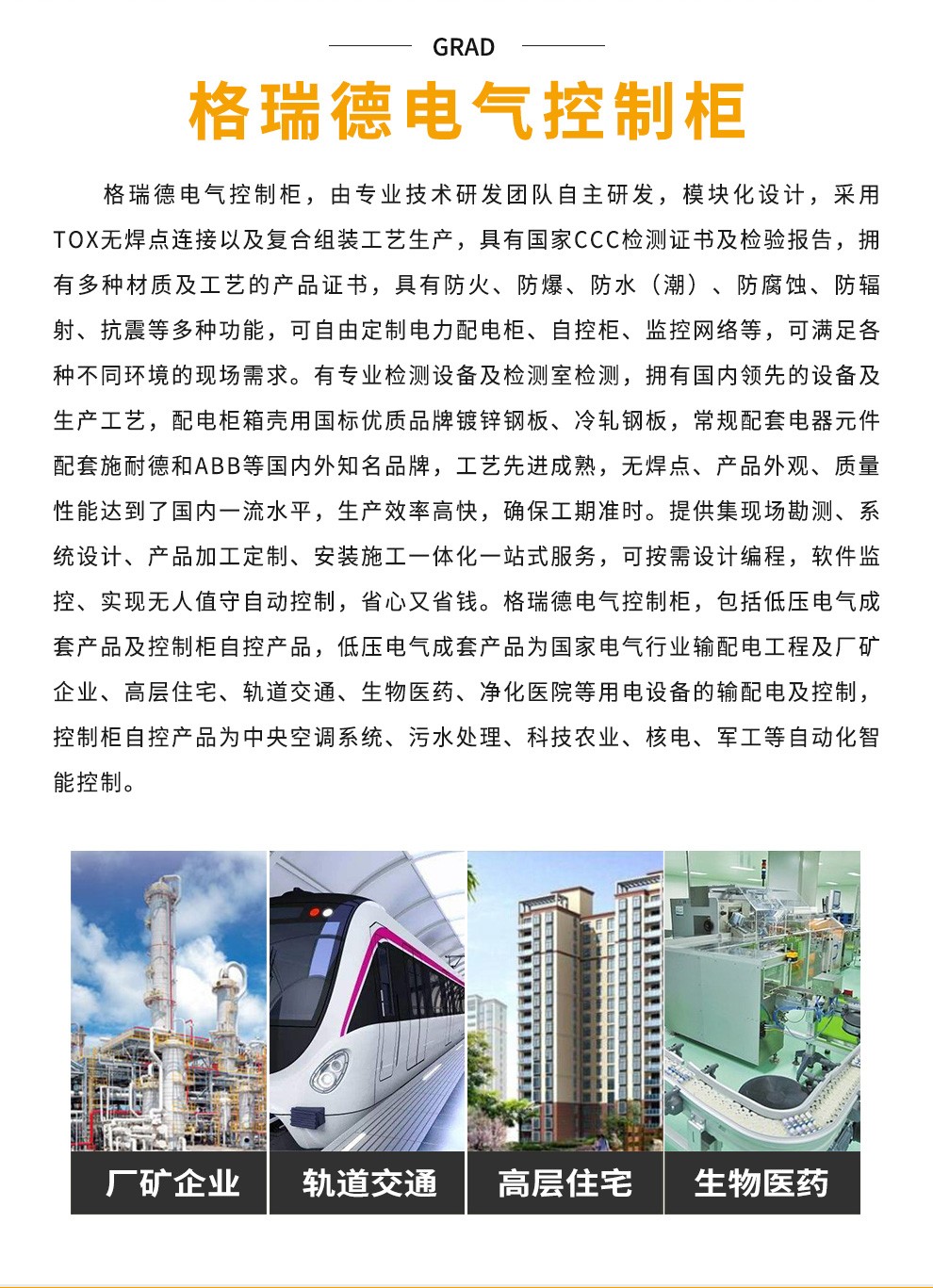 格瑞德致力于让人工环境更美好,通过打造空调工程、通风人防、复合材料、环保工程领域的全过程解决方案来满足客户需求,格瑞德构建了包括品牌规划、系统设计、技术开发、产品制造、整体施工、维护服务、检测认证、人才交流、产业集群的全生命周期产业链和产业生态。