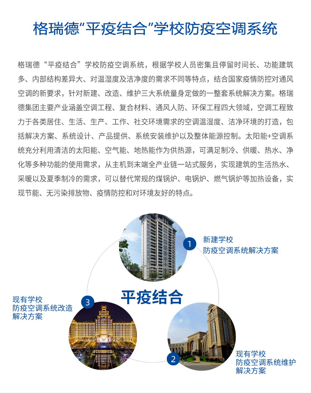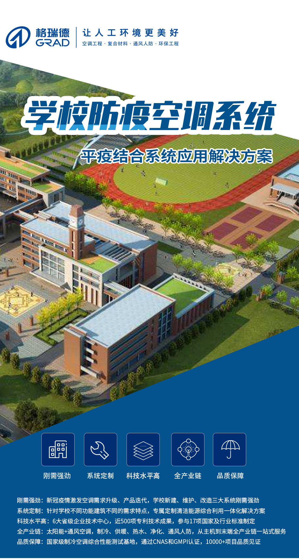 格瑞德致力于让人工环境更美好,通过打造空调工程、通风人防、复合材料、环保工程领域的全过程解决方案来满足客户需求,格瑞德构建了包括品牌规划、系统设计、技术开发、产品制造、整体施工、维护服务、检测认证、人才交流、产业集群的全生命周期产业链和产业生态。