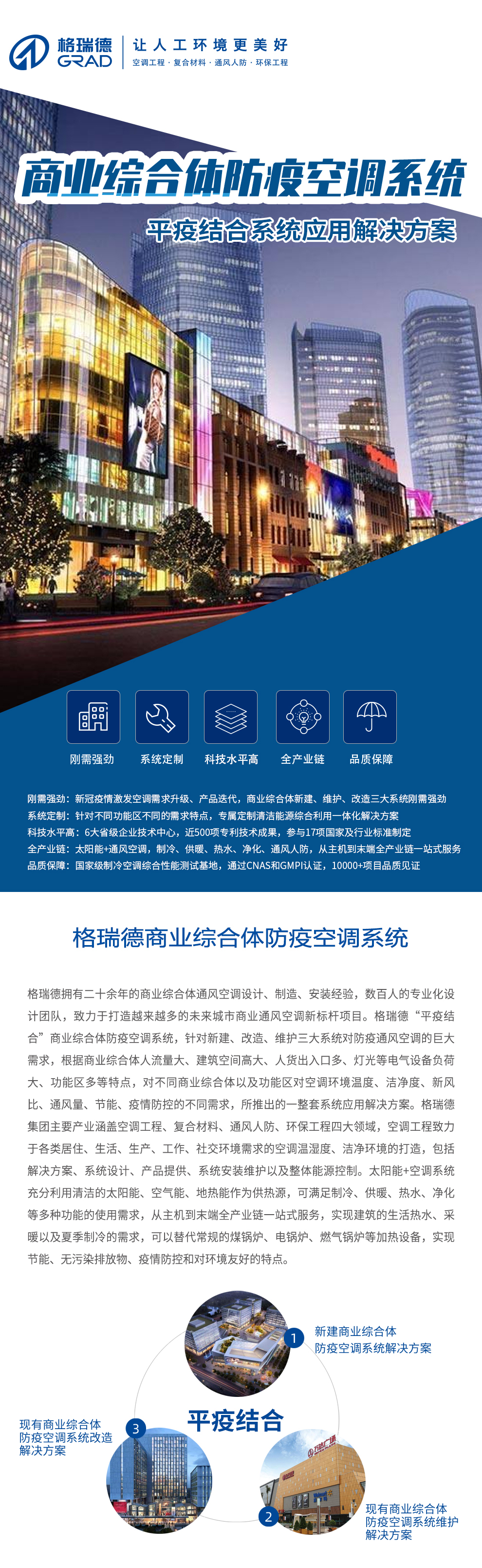 格瑞德致力于让人工环境更美好,通过打造空调工程、通风人防、复合材料、环保工程领域的全过程解决方案来满足客户需求,格瑞德构建了包括品牌规划、系统设计、技术开发、产品制造、整体施工、维护服务、检测认证、人才交流、产业集群的全生命周期产业链和产业生态。